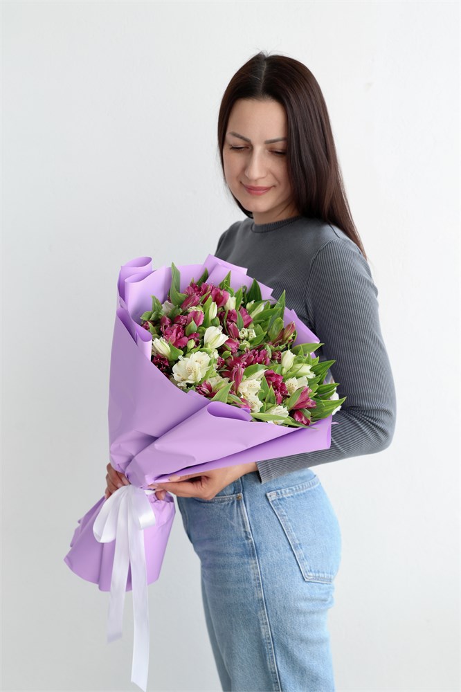Объёмный букет из 21 альстромерии микс в стильной упаковке.