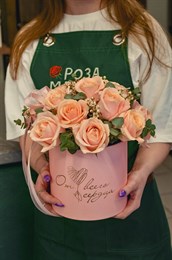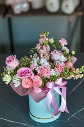 Шляпная коробка мини из роз, гвоздик и маттиолы