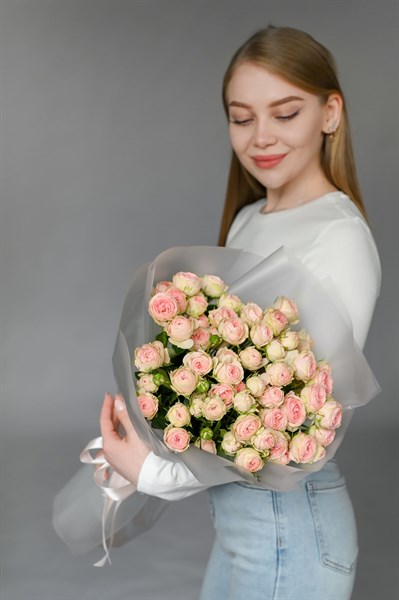 СКАЖИ ЦВЕТАМИ! 15 кустовых роз Грандмас Файнес Кэти с бутонами-шариками от кремового цвета по краям до нежно-розового к центру.