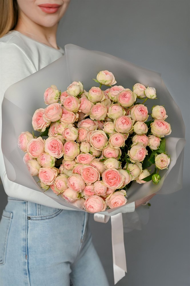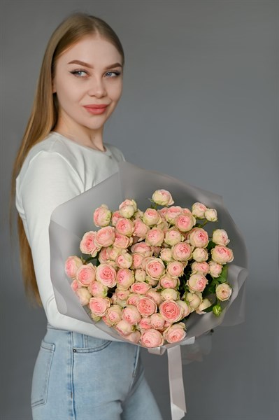 СКАЖИ ЦВЕТАМИ! 21 кустовая роза Грандмас Файнес Кэти с бутонами-шариками от кремового цвета по краям до нежно-розового к центру.