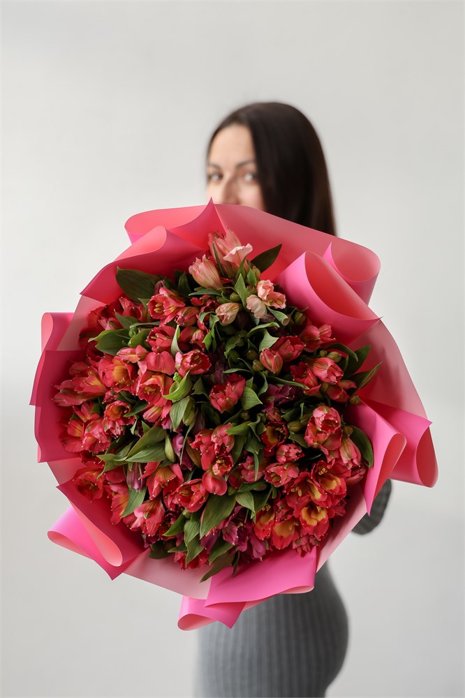 Объёмный букет из 21 альстромерии микс в стильной упаковке.
