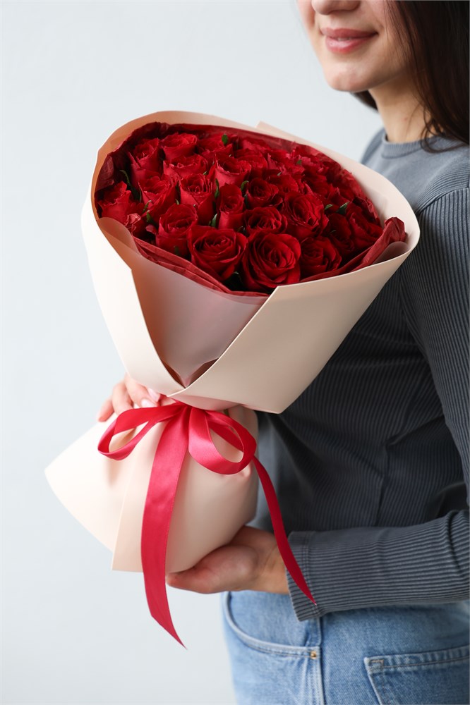 Классический букет из красных кенийских роз в дизайнерской упаковке.