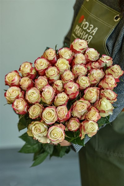 Плотные бутоны с красивым раскрытием. Лепестки кремового цвета окрашены по краю в малиновый цвет.