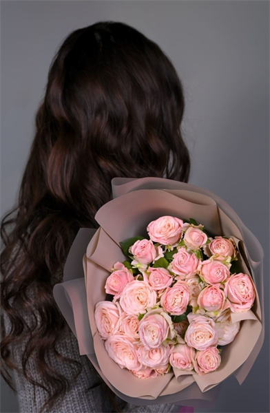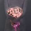 Букет в нежной гамме из кустовых роз. Упаковка из матовой пленки с атласной лентой.
