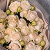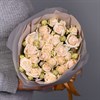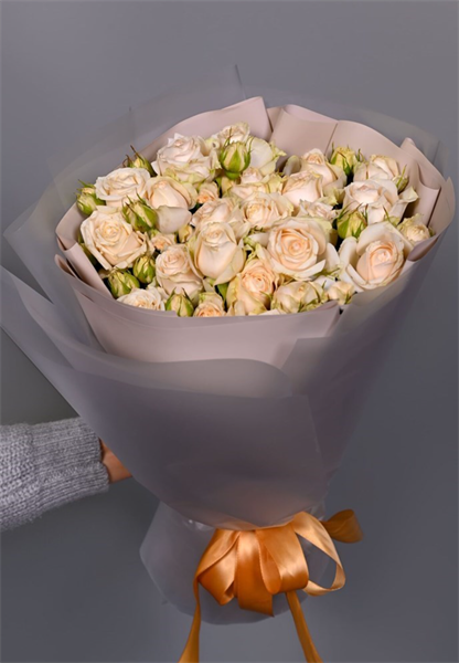 Букет в нежной гамме из кустовых роз. Упаковка из матовой пленки с атласной лентой.