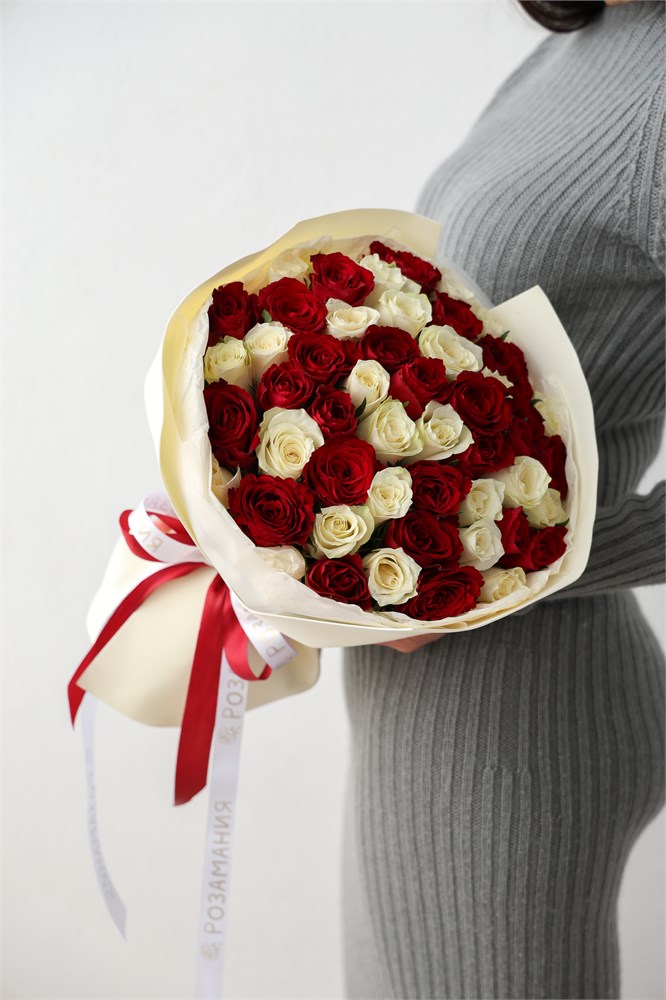 51 роза из Кении в классическом красно-белом сочетании. Каждый бутон словно хранит в себе целую вселенную эмоций, способных рассказать о любви и нежности, о надеждах и мечтах.