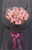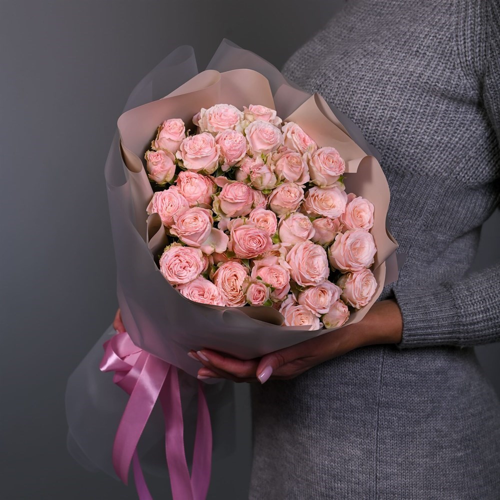 Букет в нежной гамме из кустовых роз. Упаковка из матовой пленки с атласной лентой.