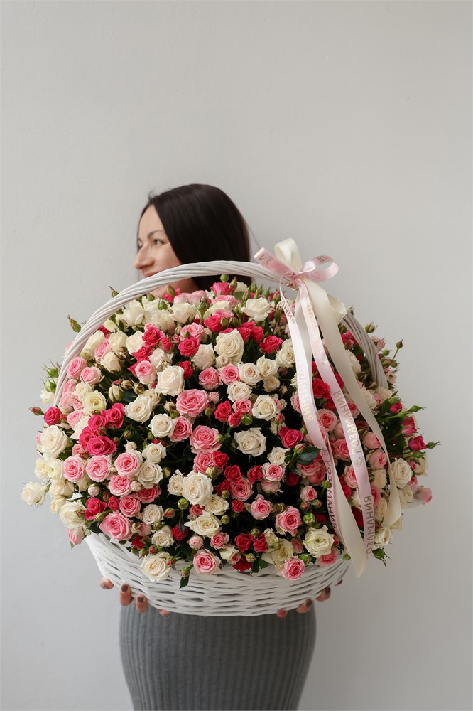 Шикарная корзина с кустовыми розами микс. В составе 75 кустовых роз.