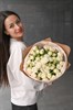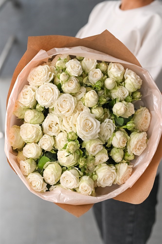 Белоснежный букет из кустовых роз. Упаковка из крафта и тишью с атласной лентой.