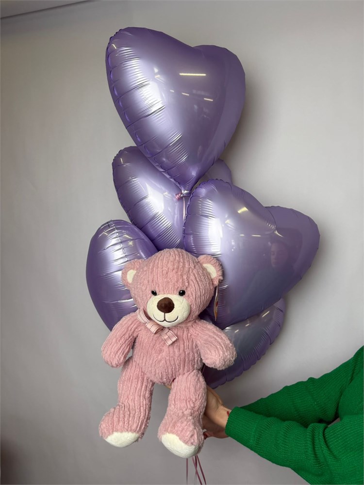 Сет состоит из 5 шаров сердец и плюшевого мишки.