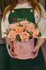 Нежная шляпная коробка с персиковыми розами, эвкалиптом и хамелациумом.