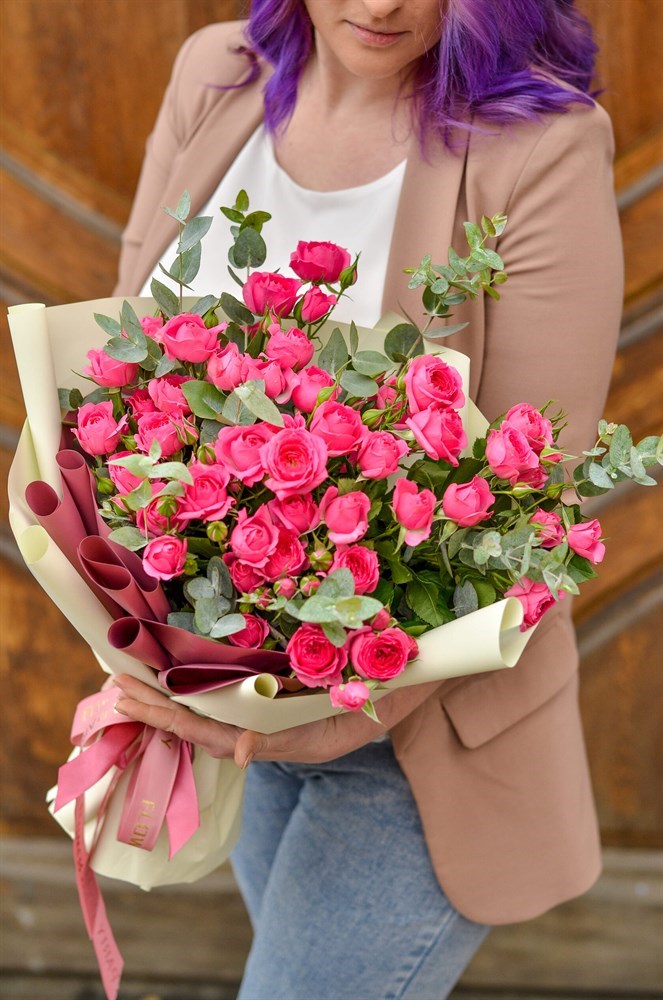 Букет из ярких кустовых роз в сочетании с веточками эвкалипта поднимет настроение и оставит незабываемые впечатления.